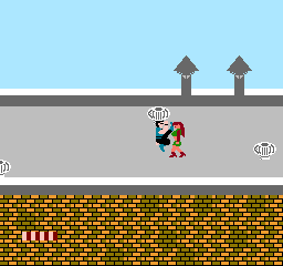 The wizards at Active Enterprises were crafty enough to make two levels into five by implementing pallete swaps and vague graphical changes, creating the illusion of a world where subway tunnels and rooftops are all that exist. Tragically, sending Slasher off the side of one of these rooftops or in front of an incoming train is not a gameplay option.