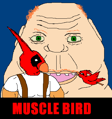 ![]() Muscle Bird In Muscle Bird, you play as ordinary cardinal Tweet Lord. Randal Sneer, world famous pervert and owner of the fattest head documented, kidnaps your girlfriend Redtail, hiding her in one of his many cranial folds. When an enraged Tweet Lord puts forth an offering of twigs and seed to his Pagan gods, he is granted the gift of an immaculately built human body, a suitable tool for rescuing his lady love from Sneer's sinister plot. Enjoy sixteen levels of flying fat and furious fists as you pile through Randal Sneer's disgusting head in search for your girlfriend. Terrifying demons have spawned off of long forgotten White Castle hamburgers and will serve to stunt your progress, but with a combined arsenal of pure American beefcake and soothing bird songs, you can calm the beasts and force feed them to your tormenter. But beware, as witnessing Randal answer nature's messier call and enjoying hentai will send even the mind of a bird reeling into insanity. The game ends when you rescue Redtail and stuff Randal's head so full that his curiously thin body snaps in two. Be swift about it, though, as taking too long will cause Redtail to absorb too much head stink and become a demon. This game will make even the most hardened gamer break into a anxious sweat.