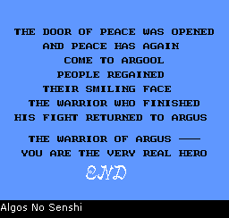 All Hermit Dens While I suspect that I may be biased towards the western version's music (It is, depressingly enough, some of the first music I have memories of), I really don't think we missed much for the lack of the full Japanese soundtrack (The curious may check the downloads section for the Japanese version's NSF). Also of note is that the ending of Algos No Senshi sports some very mangled usage of the english language. The grammar was cleaned up a bit when brought over (Surprising considering that the rest of the game's translation seems quite lazy), but otherwise the text is pretty much the same.