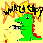 A lot of internet websites have mascots. None that I can think of right now but I'm sure a lot do because it's fun to have a mascot. I like to have fun so I decided to make myself a mascot.I didn't want to be all lame and take a character from some other game as a mascot. That kinda shit flew at the old 8-Bit Toaster, but NO MORE, NOT AT SWEETBEE'S GAME HIVE!!! Anyway, a few weeks ago I drew a picture of a dinosaur with a big explosive word bubble exlaiming "WHAT'S UP?" I pictured the dinosaur saying it in a raspy, Bulbasaurish voice and thought it was really cute. Later on I thought, hey, what a perfect mascot for my site! That was yesterday and although I didn't have a scanner, I did have 15 minutes and Microsoft Paint. And so it goes. The drawing was better but I think this gets the point across too. What does this have to do with videogames? He's holding an NES controller in his hand! And he chomped off the wire too! And the other end is causing a fire! How cool is that!? Seriously for a second, I'd like to note this isn't a play on those stupid Budweiser ads. It's WHAT'S UP? and not Wuzzzap and those damn commercials wern't funny to begin with. Here is an interview I conducted with WHAT'S UP? for the site. I hope you enjoy it rigorously.